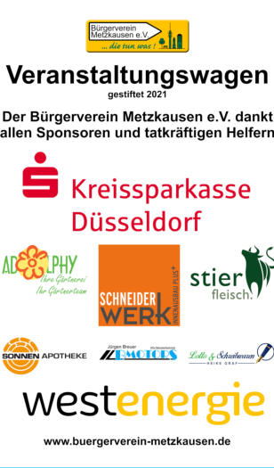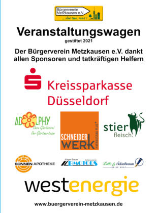 Partner, Spender und Sponsoren des Bürgerverein Metzkausen e.V.Der Verein setzt sich für die Einwohner ein. Die Mitgliedschaft im Verein ist preiswert. Damit wir trotzdem Feste veranstalten, das Mahnmal Wilhelmshöhe pflegen oder neue Spielgeräte für Spielplätze anschaffen können, sind wir auf Spender und Sponsoren angewiesen.Der Verein bedankt sich bei allen, die unsere Arbeit mit Geld und Sachspenden oder mit persönlichem Einsatz möglich machen. Wenn auch Sie sich engagieren wollen, wenden Sie sich bitte an unsere Kassenwartin, Frau Anette Regenhardt. Auf Wunsch stellen wir eine Spendenquittung aus.Der Bürgerverein ist neutral und unabhängig ! Wir freuen uns über die Unterstützung von Unternehmen, die durch Ihre Zuwendungen unsere Arbeit möglich machen.Zu unseren Partnern gehören z.B.: